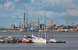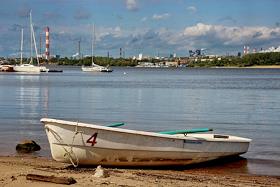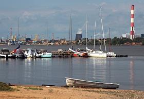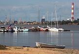 Виды города Череповец. Река Шексна. Лодки и яхты на фоне индустриального пейзажа.