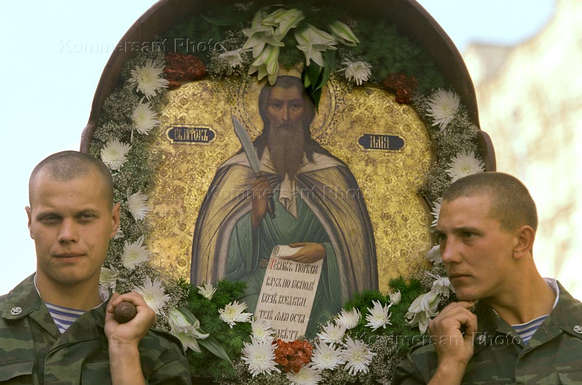 Russian paratroopers take part in the religious procession held in Ilyinka Street on the Ilia the Prophet Day. Ilia is believed to be the saint patron of the Russian Air Born Force (VDV).