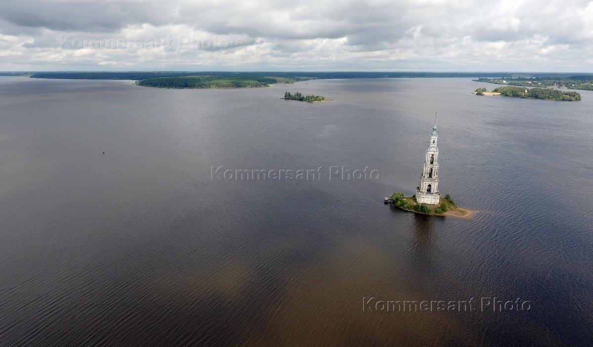 Жанровая фотография. Угличское водохранилище. Колокольня затопленного Никольского собора Троицкого Макарьевского монастыря.