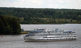 Жанровая фотография. Угличское водохранилище. Пассажирский теплоход вблизи колокольни затопленного Никольского собора Троицкого Макарьевского монастыря.