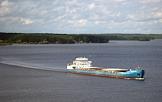 Жанровая фотография. Угличское водохранилище. Грузовое судно вблизи колокольни затопленного Никольского собора Троицкого Макарьевского монастыря.