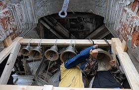 Установка колоколов на затопленную колокольню Никольского собора бывшего Николо-Жабенского монастыря
