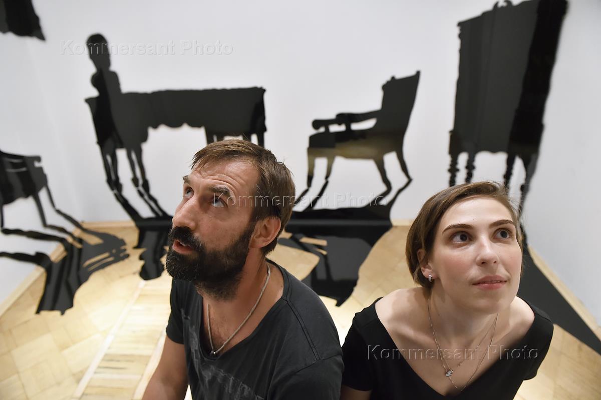 Церемония открытия выставки-инсталляции по повести В.Н.Гоголя "Портрет" в Новом крыле Дома Гоголя. Авторы инсталляции, художники Анна Румянцева (справа) и Алексей Трегубов (слева) во время церемонии открытия.