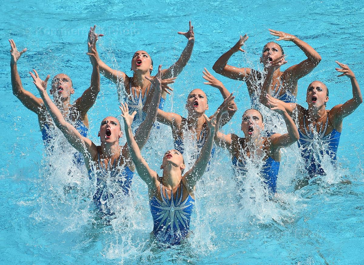 XXXI летние Олимпийские игры в Рио-де-Жанейро. Cоревнования по синхронному плаванию среди групп. Спортсменки сборной России выступают с произвольной программой.