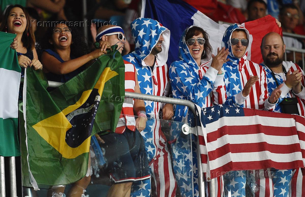 XXXI летние Олимпийские игры в Рио-де-Жанейро. Финал соревнований по групповому синхронному плаванию. Бразильские и американские болельщики на трибуне во время соревнований.