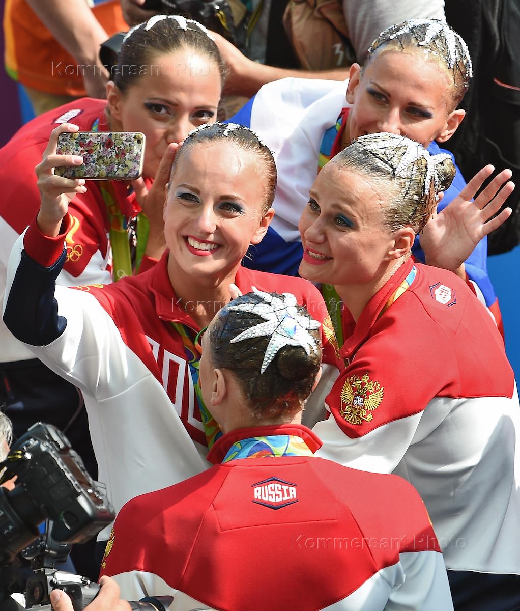 XXXI летние Олимпийские игры в Рио-де-Жанейро. Соревнования по синхронному плаванию. Члены олимпийской сборной команды России, завоевавшие золотые медали в соревнованиях по синхронному плаванию среди групп, во время церемонии награждения.