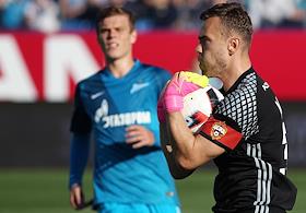 Чемпионат России по футболу. Премьер-лига. 4-ый тур. Матч между командами "Зенит" (Санкт-Петербург) и ЦСКА (Москва). Вратарь команды ЦСКА Игорь Акинфеев (справа) во время матча.