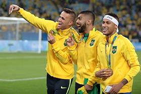 XXXI летние Олимпийские игры в Рио-де-Жанейро. Финальный матч по футболу среди мужчин между сборными командами Бразилии и Германии. Сборная Бразилии одержала победу. Капитан сборной команды Бразилии Неймар (справа) после окончания церемонии награждения.