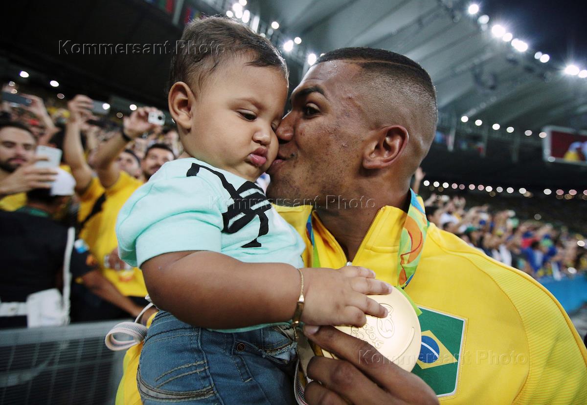 XXXI летние Олимпийские игры в Рио-де-Жанейро. Финальный матч по футболу среди мужчин между сборными командами Бразилии и Германии. Сборная Бразилии одержала победу. Игрок сборной команды Бразилии Маркиньуш с сыном после окончания церемонии награждения.