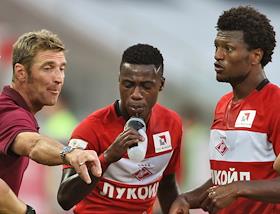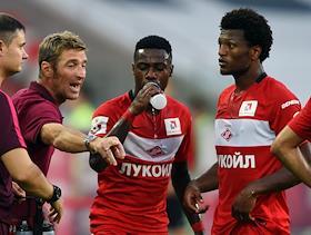 РОСГОССТРАХ - Чемпионат России по футболу. Премьер-лига. 4-й тур. Матч между командами "Спартак" (Москва) - "Краснодар" (Краснодар) на стадионе "Открытие Арена". Слева направо: главный тренер команды "Спартак" Массимо Каррера, игроки команды "Спартак" Квинси Промес и Зе Луиш во время матча.