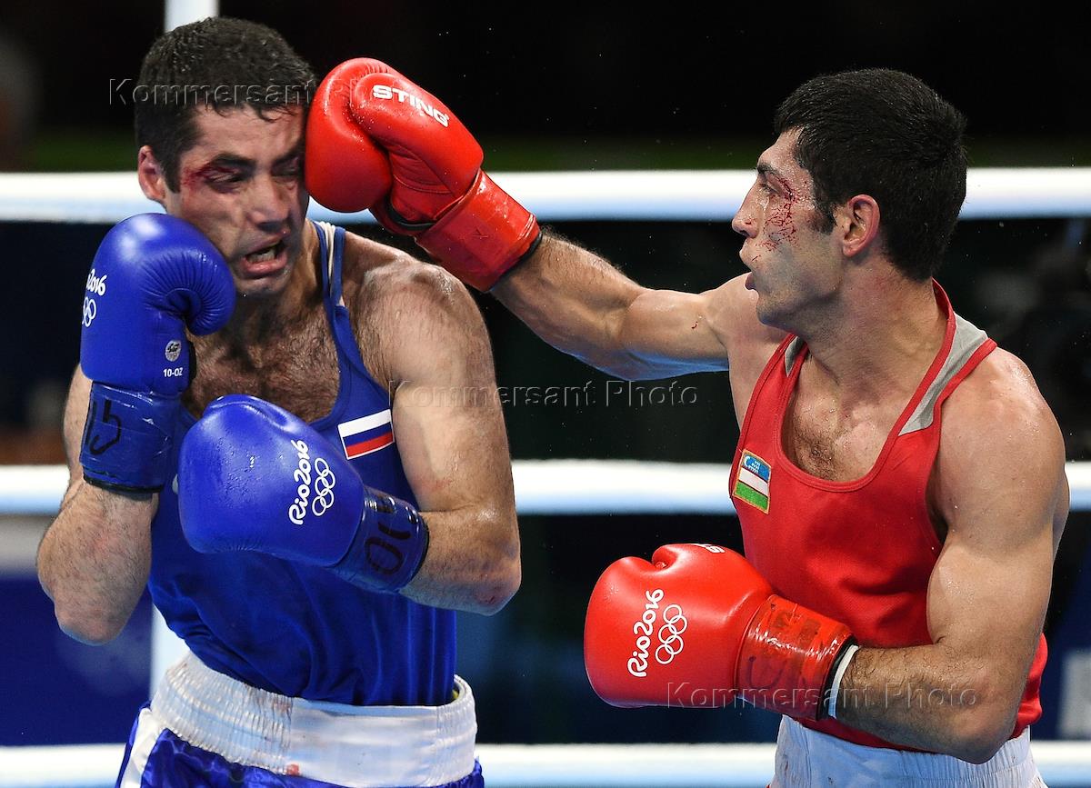 XXXI летние Олимпийские игры в Рио-де-Жанейро. Cоревнования по боксу среди мужчин в весовой категории до 52 кг. Член сборной России Миша Алоян во время финального поединка c членом сборной Узбекистана Шахобиддином Заировым.