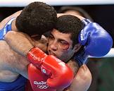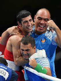 XXXI летние Олимпийские игры в Рио-де-Жанейро. Соревнования по боксу среди мужчин в весовой категории до 52 кг. Член олимпийской сборной команды Узбекистана по боксу Шахобиддин Заиров (слева) после окончания соревнований.