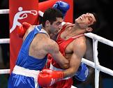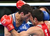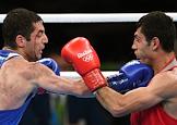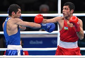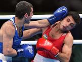 XXXI летние Олимпийские игры в Рио-де-Жанейро. Cоревнования по боксу среди мужчин в весовой категории до 52 кг. Член сборной России Миша Алоян во время финального поединка c членом сборной Узбекистана Шахобиддином Заировым.