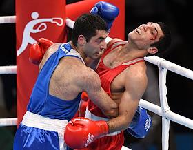 XXXI летние Олимпийские игры в Рио-де-Жанейро. Соревнования по боксу среди мужчин в весовой категории до 52 кг. Член олимпийской сборной команды России по боксу Миша Алоян (слева) и член олимпийской сборной команды Узбекистана по боксу Шахобиддин Заиров (справа) во время соревнования.