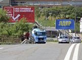 Подготовка к выборам дептутатов Государственной думы России седьмого созыва. Предвыборная агитация. Агитационные плакаты Коммунистической партии России (КПРФ) "Мы правы! Мы сможем!" и Либерально-демократической партии России (ЛДПР) на одной из улиц Владивостока.