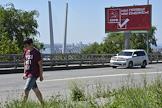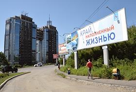 Подготовка к выборам дептутатов Государственной думы России седьмого созыва. Предвыборная агитация. Агитационный плакат партии "Единая Россия" "Край, наполненный жизнью" на одной из улиц Владивостока.