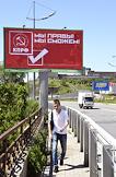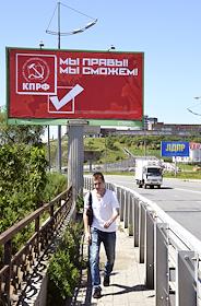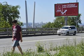 Подготовка к выборам дептутатов Государственной думы России седьмого созыва. Предвыборная агитация. Агитационный плакат Коммунистической партии России (КПРФ) "Мы правы! Мы сможем!" на одной из улиц Владивостока.