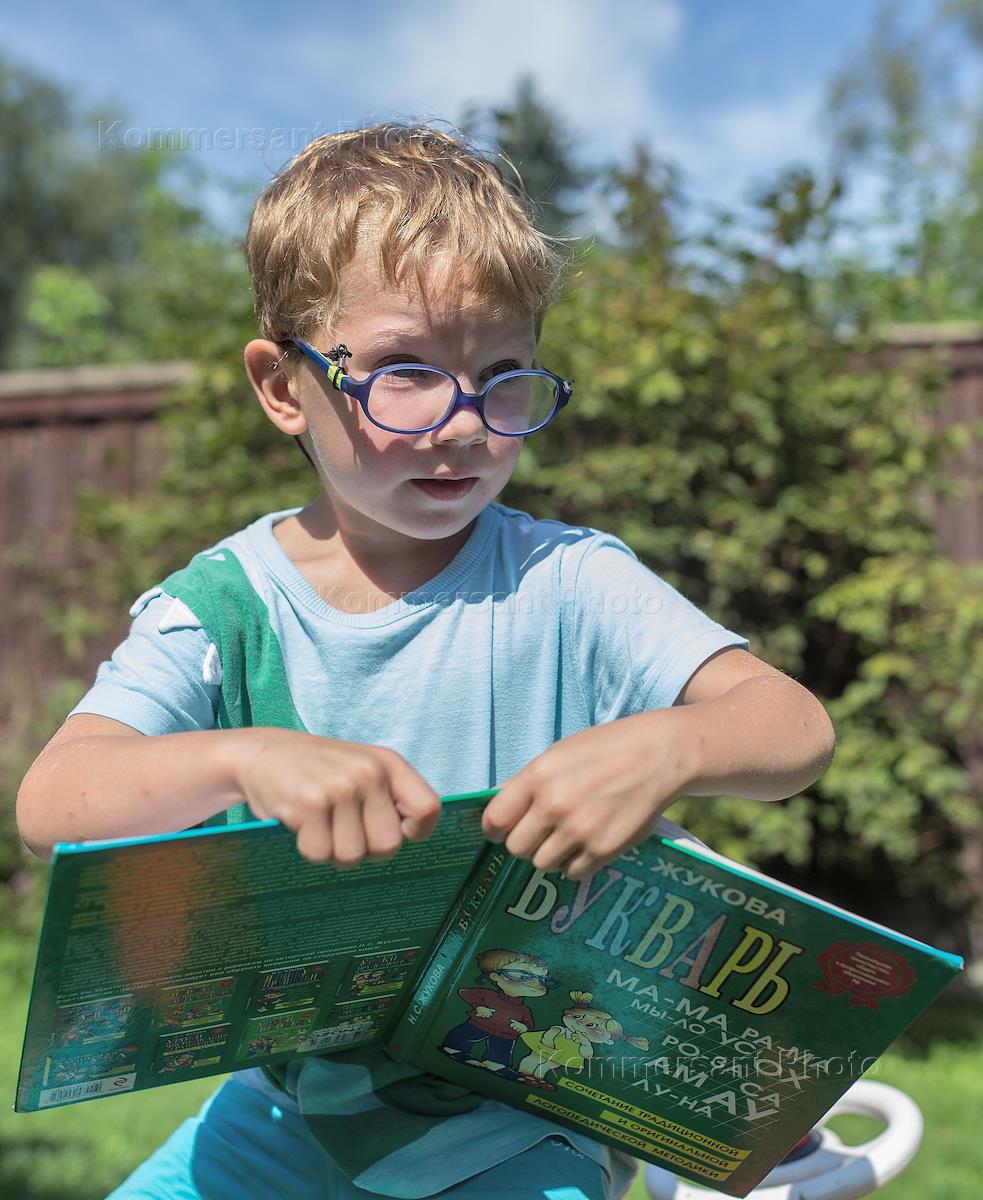 Малыш в очках на лужайке, сидя на машинке, читает букварь, в это время другие дети играют в футбол.