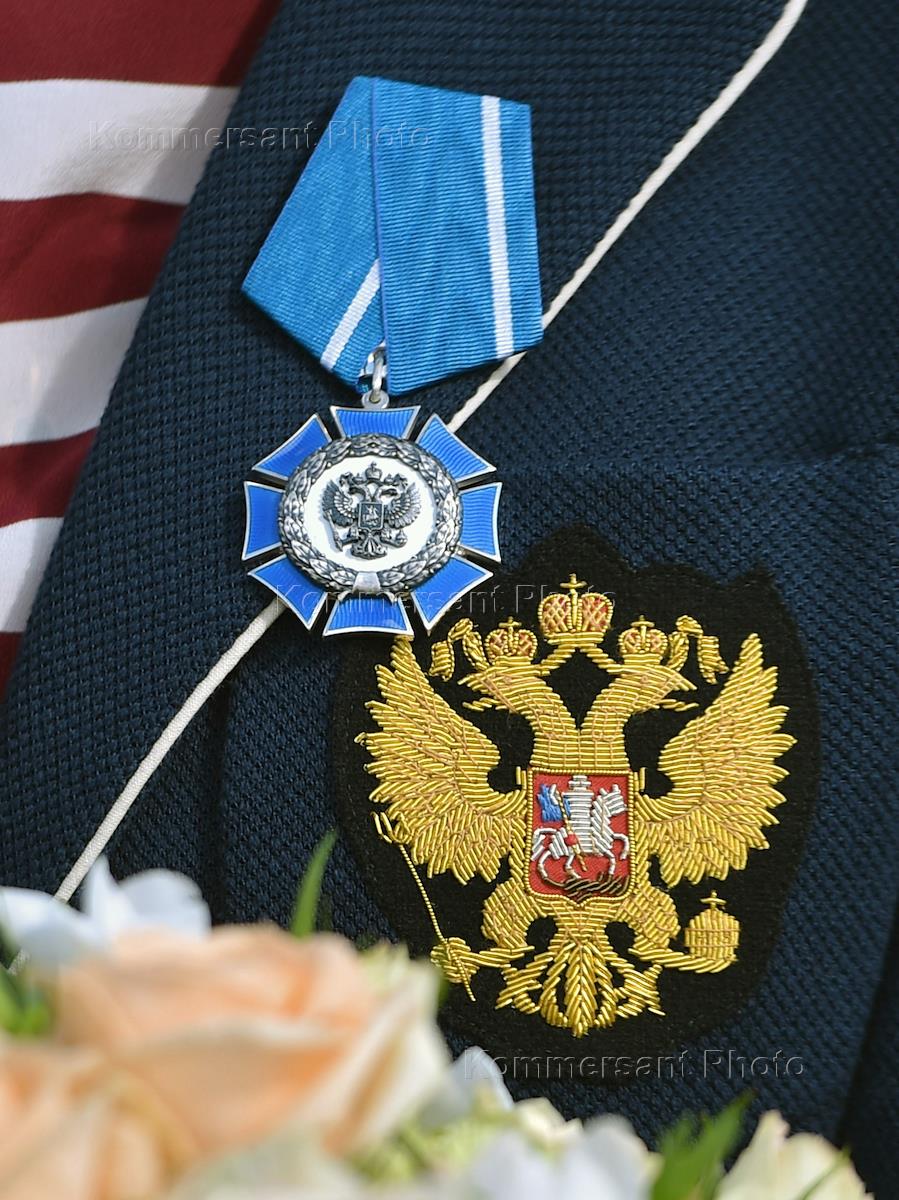 Церемония вручения автомобилей российским спортсменам - победителям и призерам Игр XXXI Олимпиады в Рио-де-Жанейро прошла на Ивановской площади Московского Кремля. Орден Почета на пиджаке олимпийской чемпионки по фехтованию на саблях Софьи Великой.