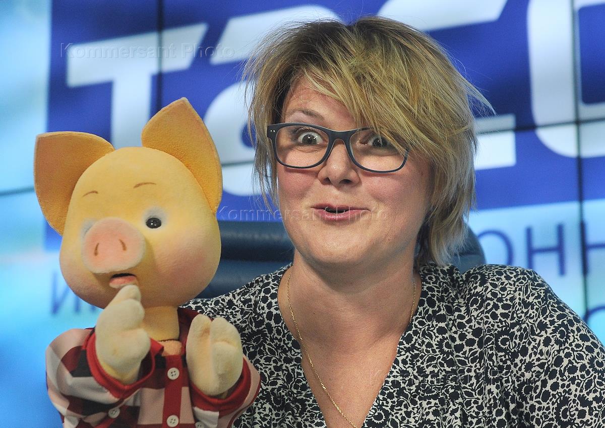 Актриса Оксана Чабанюк, озвучивающая героя передачи "Спокойной ночи, малыши!" Хрюшу, во время пресс-конференции, посвященной презентации нового формата детской передачи "Спокойной ночи, малыши!".