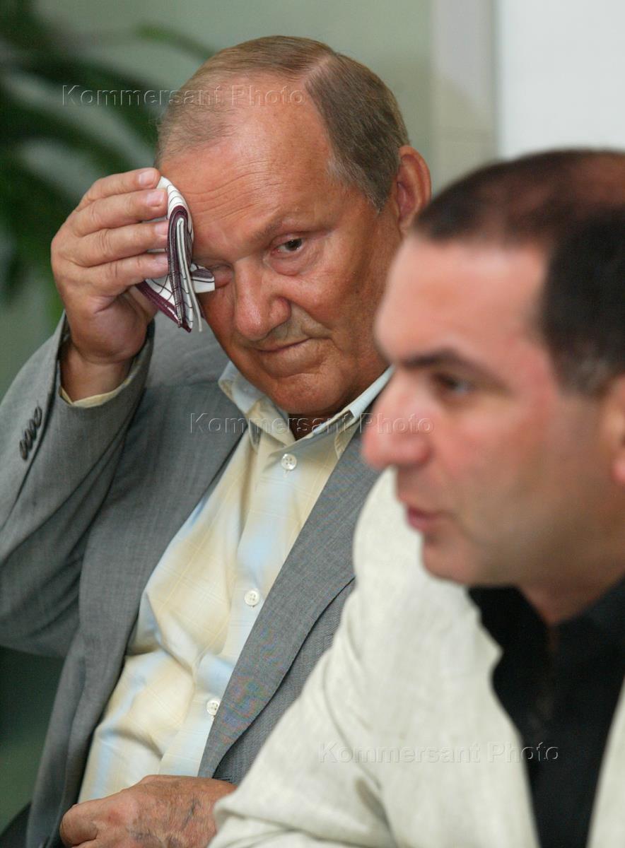Председатель Ассоциации российских банков (АРБ) Сергей Егоров (слева) и президент АРБ Гарегин Тосунян (справа) во время пресс-конференции, посвященной 15-летию со дня создания первых коммерческих банков в России. Пресс-конференция состоялась в здании АРБ.