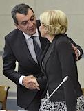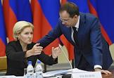 Рабочая поездка президента России Владимира Путина на Алтай. Заместитель председателя правительства России Ольга Голодец (слева) и министр культуры России Владимир Мединский (справа) во время заседания президиума Государственного совета "О мерах по повышению инвестиционной привлекательности санаторно-курортного комплекса в Российской Федерации". Заседание прошло в курортном комплексе "Белокуриха".