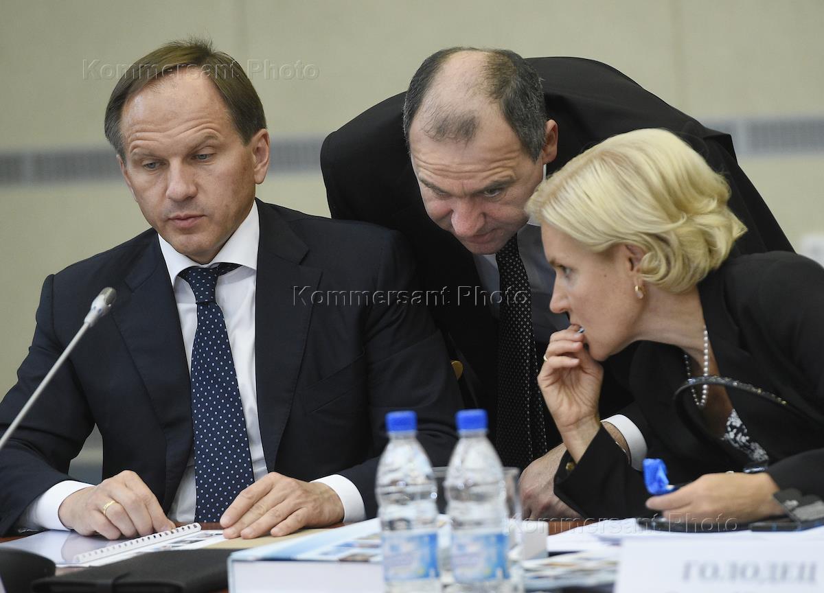 Рабочая поездка президента России Владимира Путина на Алтай. Министр природных ресурсов и экологии России Сергей Донской (слева) и Заместитель министра здравоохранения России Татьяна Яковлева (в центре) во время заседания президиума Государственного совета "О мерах по повышению инвестиционной привлекательности санаторно-курортного комплекса в Российской Федерации". Заседание прошло в курортном комплексе "Белокуриха".