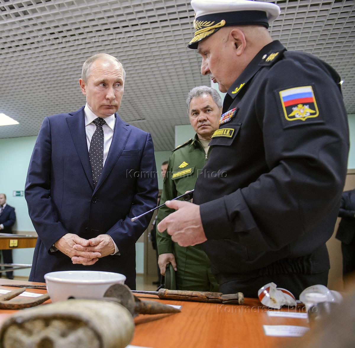 Рабочая поездка президента России Владимира Путина во Владивосток. Слева направо: президент России Владимир Путин, министр обороны России Сергей Шойгу, командующий Тихоокеанским флотом адмирал Сергей Авакянц во время осмотра экспозиции музея в ходе посещения филиала Нахимовского военно-морского училища.