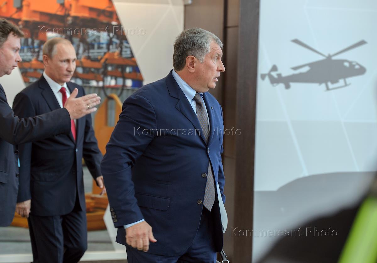Рабочая поездка президента России Владимира Путина в Приморский край. Президент России Владимир Путин (справа) и главный исполнительный директор, председатель правления, заместитель председателя совета директоров ПАО "НК "Роснефть" Игорь Сечин (слева) во время посещения судостроительного комплекса "Звезда" в городе Большой Камень.