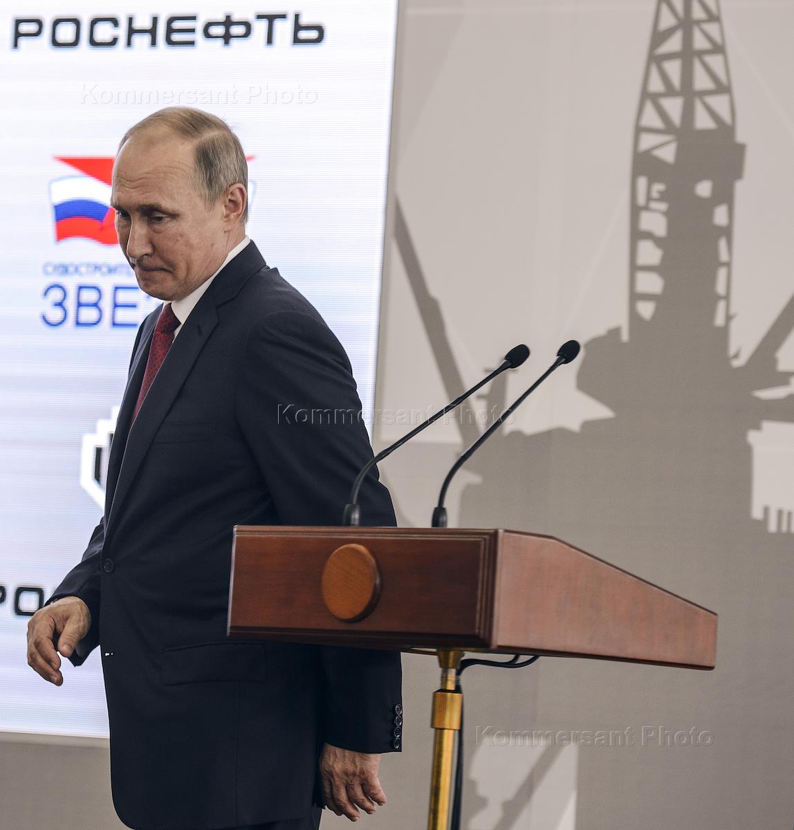 Russian President Vladimir Putin (centre) and Chief Executive Officer, Chairman of the Management Board, Deputy Chairman of the Board of Directors of Rosneft Igor Sechin (right) during Vladimir Putin's visit to the Zvesda shipyard in the town of Bolshoi Kamen.