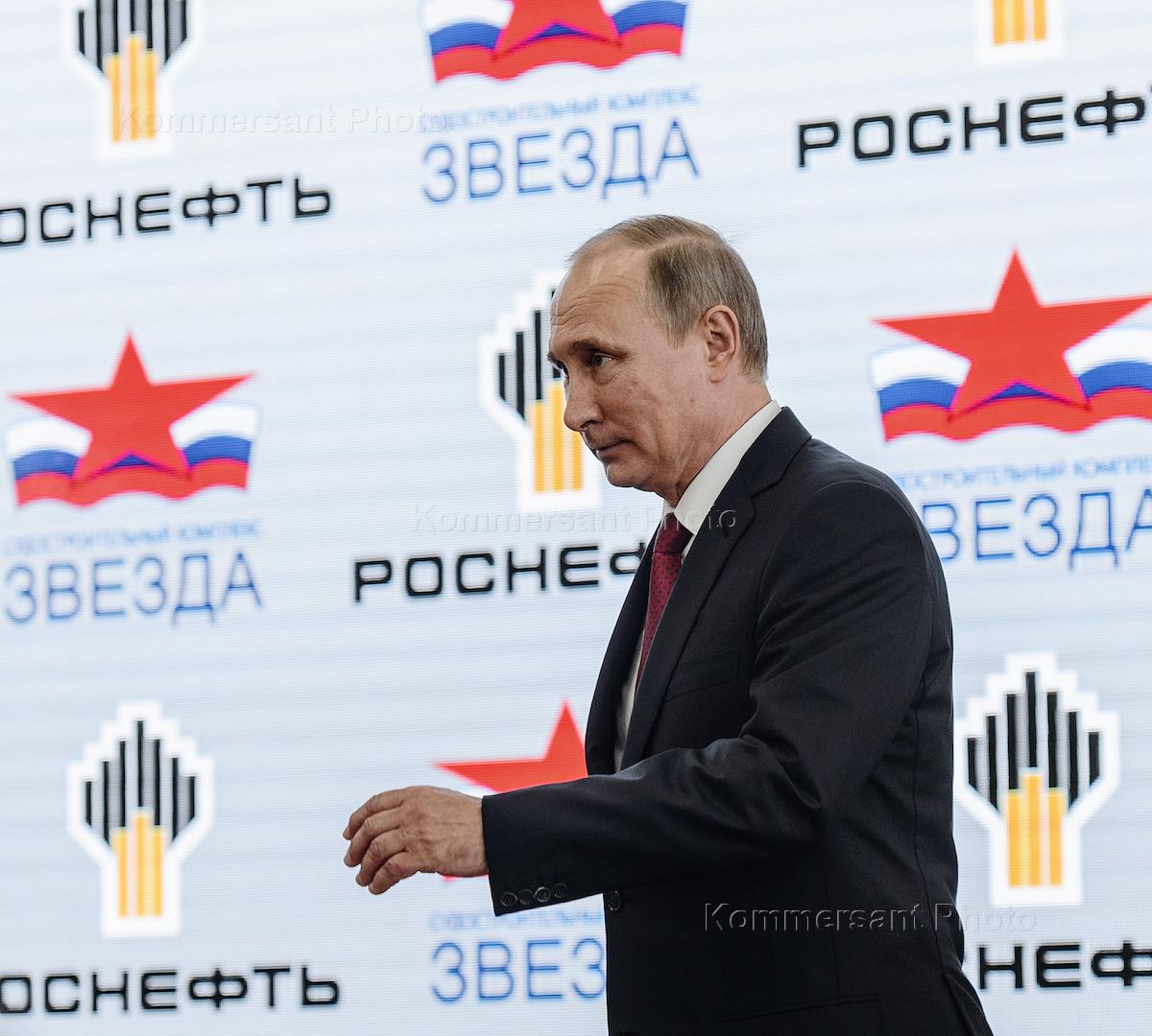 Russian President Vladimir Putin (centre) and Chief Executive Officer, Chairman of the Management Board, Deputy Chairman of the Board of Directors of Rosneft Igor Sechin (right) during Vladimir Putin's visit to the Zvesda shipyard in the town of Bolshoi Kamen.