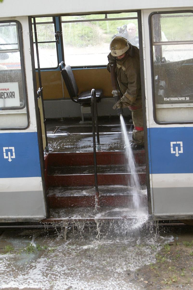 Fireman washes away the remains of the chemicals from the tramway. The chemicals spilled from the passenger's can. Some of the passengers were burnt.