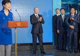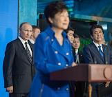 Рабочая поездка президента России Владимира Путина в Дальневосточный федеральный округ. II Восточный экономический форум. Президент России Владимир Путин ( cлева), премьер-министр Японии Синдзо Абэ (в центре) и президент Южной Кореи Пак Кын Хе (справа) перед началом пленарного заседания "Открывая Дальний Восток".