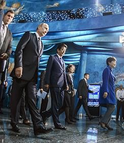 Рабочая поездка президента России Владимира Путина в Дальневосточный федеральный округ. Премьер-министр Японии Синдзо Абэ (слева), директор Института биологии моря Дальневосточного отделения Российской академии наук (РАН), научный руководитель проекта Приморского океанариума Андрей Адрианов (третий слева), президент России Владимир Путин (в центре) и президент Южной Кореи Пак Кын Хе (справа) во время посещения Приморского океанариума Дальневосточного отделения Российской академии наук на острове Русский.