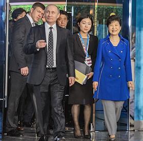 Рабочая поездка президента России Владимира Путина в Дальневосточный федеральный округ. Президент России Владимир Путин ( cлева) и президент Южной Кореи Пак Кын Хе (справа) во время посещения Приморского океанариума Дальневосточного отделения Российской академии наук на острове Русский.