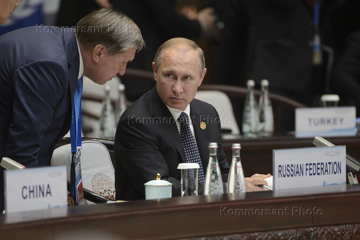Рабочая поездка президента России Владимира Путина в Китай. Саммит G20. Президент России Владимир Путин (справа) во время рабочего заседания глав делегаций государств-участников "Группы двадцати", приглашенных государств и международных организаций в Ханчжоу.