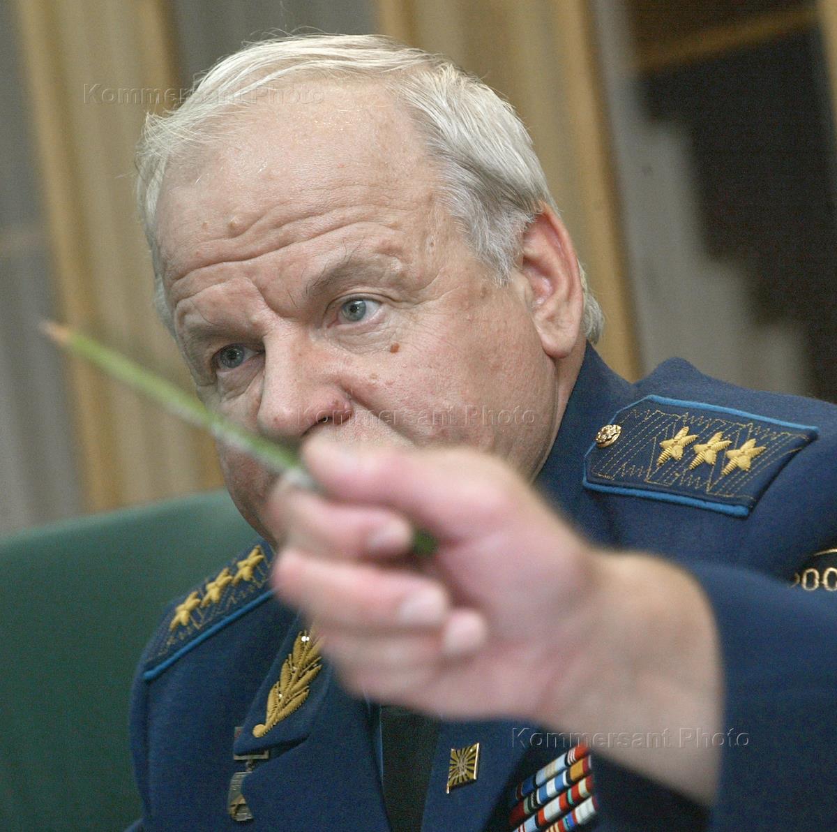 Главнокомандующий Военно-воздушных Сил России (ВВС) Владимир Михайлов на пресс-конференции "ВВС: состояние и перспективы развития. Участие ВВС в отраслевой выставке-ярмарке "МАКС 2003". Пресс-конференция приурочена к предстоящему Дню ВВС России и прошла в конференц-зале в Управлении по использованию воздушного пространства и управлению воздушным движением министерства обороны России.