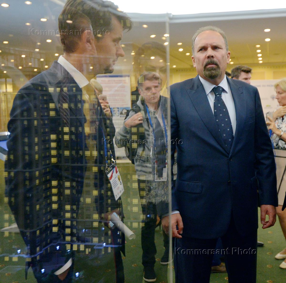 IV Всероссийское совещание по развитию жилищного строительства прошло в гостинице "Рэдиссон Славянская". Министр строительства и жилищно-коммунального хозяйства Россиии Михаил Мень перед началом совещания.