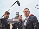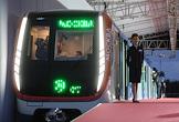Презентация поезда метро нового поколения "Москва" со сквозным проходом. Презентация прошла у главного входа на территорию ВДНХ. Руководитель департамента транспорта и развития дорожно-транспортной инфраструктуры города Москвы Максим Ликсутов (справа) во время презентации.