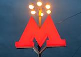 Виды вечерней Москвы. Эмблема московского метро у входа на станцию метро "ВДНХ".