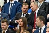 День города в Москве. Праздничные мероприятия. Торжественная церемония открытия Дня города прошла на Красной площади. Президент России Владимир Путин (справа) и председатель правительства России Дмитрий Медведев (слева) во время церемонии открытия.