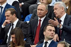 День города в Москве. Праздничные мероприятия. Торжественная церемония открытия Дня города прошла на Красной площади. Справа налево: мэр Москвы Сергей Собянин, президент России Владимир Путин, председатель правительства России Дмитрий Медведев, представитель от исполнительного органа власти города Москвы в Совете Федерации России Владимир Долгих во время церемонии открытия.