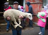 Мусульманин с бараном на руках в день праздника жертвоприношения Курбан-байрам в Уфе.