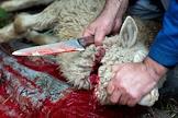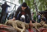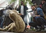 Мусульмане режут жертвенных баранов в день праздника жертвоприношения Курбан-байрам в Уфе.