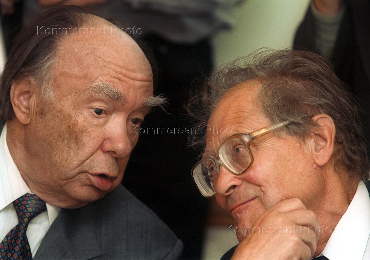 Политолог Александр Яковлев (слева)и правозащитник Сергей Ковалев (справа) на заседании круглого стола Фонда Джоржа Сороса, посвященного перспективам дальнейшего инвестирования мирового капитала в российский бизнес.