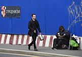 Жанровая фотография. Молодой мужчина проходит вдоль стены мимо нищего c сумкой-тележкой.