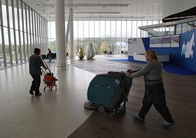 Новый терминал аэропорта Стригино. Лестница на второй этаж терминала во время уборки.
