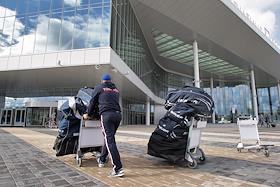 Новый терминал аэропорта Стригино. Пассажир с багажными тележками во время подхода к зданию нового терминала.
