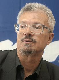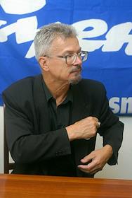 Leader of the National Bolshevik Party (NBP), Russian writer Eduard Limonov is interviewed in the Smena newspaper editorial headquarters.