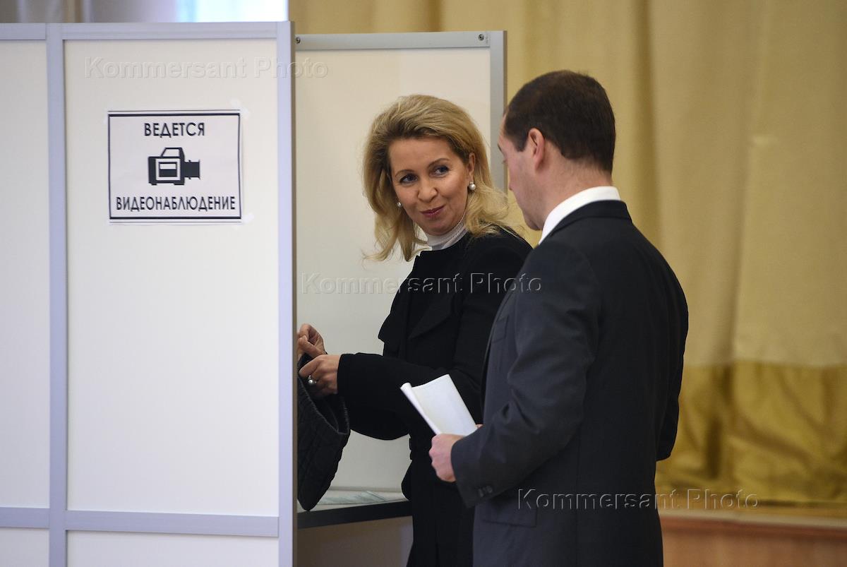 Выборы депутатов Государственной думы VII созыва. Председатель правительства России Дмитрий Медведев (слева) и его жена Светлана Медведева (справа) во время голосования на избирательном участке в СОШ № 1118.
